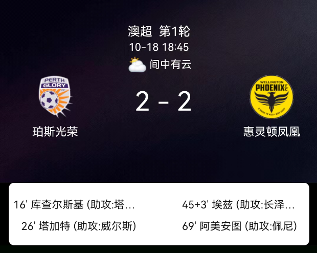 北京时间10月18日,澳大利亚足球超级联赛第1轮,珀斯光荣主场迎战惠灵顿凤凰。第16分钟,塔加特助攻库哈尔斯基破门,珀斯1-0;第23分钟,惠灵顿球员犯规吃黄;第26分钟,威尔士助攻塔加特破门,珀斯2-0;补时第3分钟,长泽和辉助攻IfeanyiEze破门,惠灵顿1-2;第69分钟,佩恩助攻阿尔米恩托扳平,惠灵顿2-2。最终比分,珀斯光荣2-2惠灵顿凤凰。