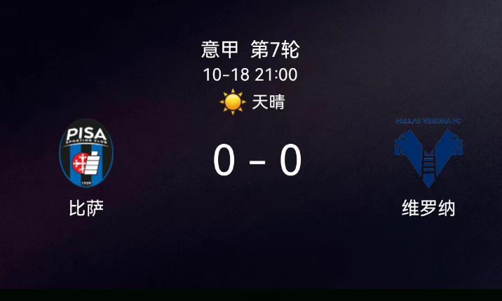 北京时间10月18日,意大利足球顶级联赛第7轮,比萨主场迎战维罗纳。第31分钟,维罗纳球员犯规吃黄;第68分钟,比萨球员犯规吃黄;全场无进球,双方均未打破僵局。最终比分,比萨0-0维罗纳。