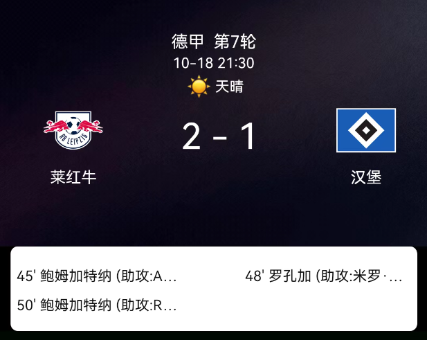 北京时间10月18日,德国足球顶级联赛第7轮,RB莱比锡主场迎战汉堡。第45分钟,鲍姆加特纳头球破门,莱比锡1-0;第48分钟,洛孔加射门变向破门,汉堡1-1;第50分钟,鲍姆加特纳再入一球,莱比锡2-1;第75分钟,汉堡球员犯规吃黄。最终比分,RB莱比锡2-1汉堡。