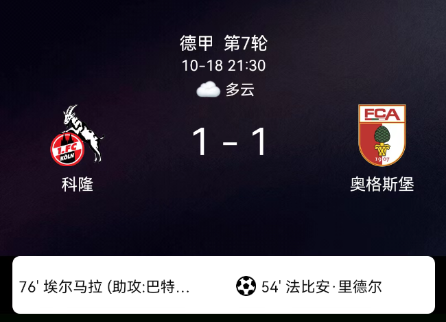 北京时间10月18日,德国足球甲级联赛第7轮,科隆主场迎战奥格斯堡。第38分钟,科隆球员犯规吃黄;第54分钟,法比安-里德罚入点球,奥格斯堡1-0;第76分钟,比尔特助攻赛义德-马拉破门,科隆1-1。最终比分,科隆1-1奥格斯堡。