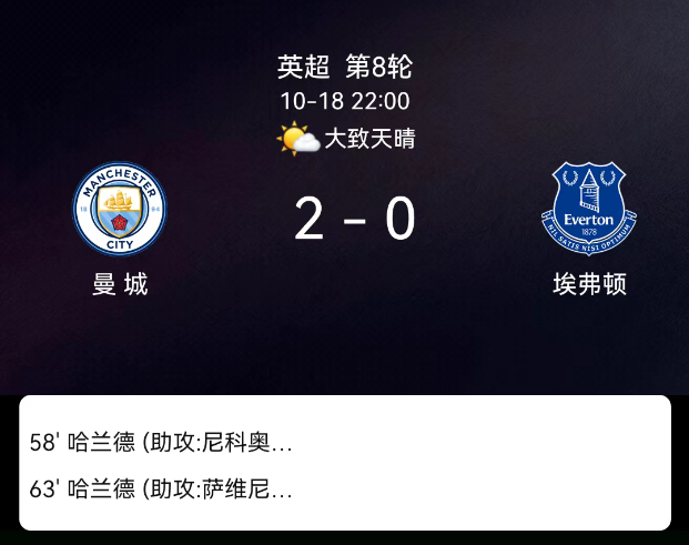 北京时间10月18日,英格兰足球顶级联赛第8轮,曼城主场迎战埃弗顿。第38分钟,埃弗顿球员犯规吃黄;第58分钟,奥赖利助攻哈兰德头槌破门,曼城1-0;第63分钟,萨维尼奥助攻哈兰德再入一球,曼城2-0;第82分钟,曼城球员犯规吃黄。最终比分,曼城2-0埃弗顿。