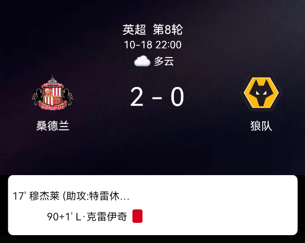 北京时间10月18日,英格兰足球超级联赛第8轮,桑德兰主场迎战狼队。第16分钟,休姆助攻穆杰莱抽射破门,桑德兰1-0;第90+3分钟,克雷伊奇解围变乌龙,桑德兰2-0。最终比分,桑德兰2-0狼队。