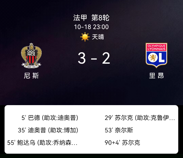 北京时间10月18日,法国足球顶级联赛第8轮,尼斯主场迎战里昂。第5分钟,迪奥普助攻巴尔劲射破门,尼斯1-0;第29分钟,舒尔茨头球破门,里昂1-1;第35分钟,迪奥普后点破门,尼斯2-1;第43分钟,里昂球员犯规吃黄;第56分钟,克洛斯助攻布道伊破门,尼斯3-1;第90+5分钟,舒尔茨破门双响,里昂2-3。最终比分,尼斯3-2里昂。