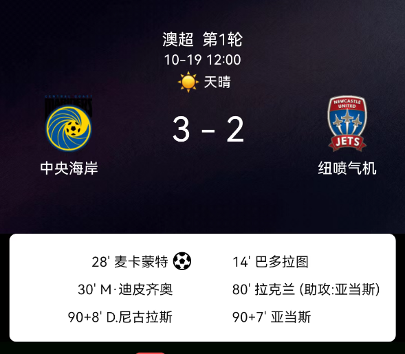 北京时间10月19日,澳大利亚足球超级联赛首轮,中央海岸水手主场迎战纽卡斯尔喷气机。第14分钟,巴多拉托破门,喷气机1-0;第28分钟,麦卡蒙特点射扳平,水手1-1;第30分钟,迪皮齐奥破门,水手2-1;第80分钟,罗斯破门,喷气机2-2;第90+8分钟,杜瓦蒂绝杀,水手3-2。最终比分,中央海岸水手3-2纽卡斯尔喷气机。
