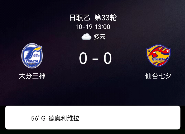 北京时间10月19日,日本职业联赛J2第33轮,大分三神主场迎战仙台七夕。第56分钟,大分三神球员格莱松-奥利韦拉染红离场;全场双方均无进球。最终比分,大分三神0-0仙台七夕。