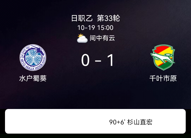 北京时间10月5日,日本职业联赛J2第32轮,水户蜀葵主场迎战千叶市原。第65分钟,水户蜀葵球员犯规吃黄;第90+6分钟,杉山直宏破门绝杀,千叶市原1-0。最终比分,水户蜀葵0-1千叶市原。