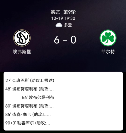 北京时间10月19日,德国足球乙级联赛第9轮,埃弗斯堡主场迎战菲尔特。第27分钟,孔泰破门,埃弗斯堡1-0;第45分钟,菲尔特球员犯规吃黄;第48分钟,埃布努塔利布破门,埃弗斯堡2-0;第56分钟,埃布努塔利布再破门,埃弗斯堡3-0;第80分钟,埃布努塔利布戴帽,埃弗斯堡4-0;第85分钟,采卡破门,埃弗斯堡5-0;第90+3分钟,勒容库尔破门,埃弗斯堡6-0。最终比分,埃弗斯堡6-0菲尔特。