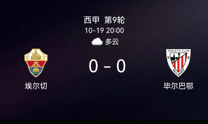 北京时间10月19日,西班牙足球甲级联赛第9轮,埃尔切主场迎战毕尔巴鄂竞技。第35分钟,埃尔切球员犯规吃黄;第72分钟,毕尔巴鄂竞技球员战术犯规吃黄;全场双方均无进球。最终比分,埃尔切0-0毕尔巴鄂竞技。