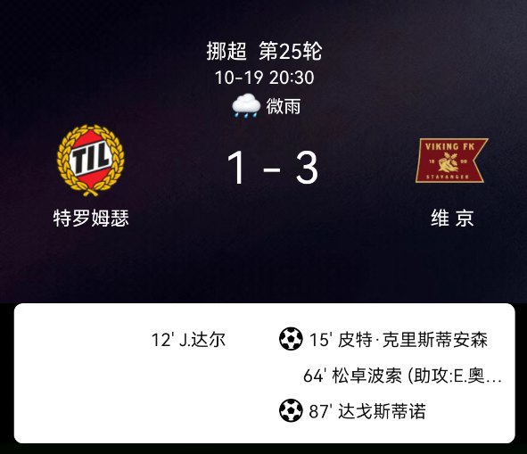 北京时间10月19日,挪威足球超级联赛第25轮,特罗姆瑟主场迎战维京。第12分钟,耶特-达尔破门,特罗姆瑟1-0;第15分钟,克里斯蒂安森点射扳平,维京1-1;第48分钟,特罗姆瑟球员犯规吃黄;第64分钟,比约尔霍尔破门,维京2-1;第87分钟,达戈斯蒂诺点射,维京3-1。最终比分,特罗姆瑟1-3维京。