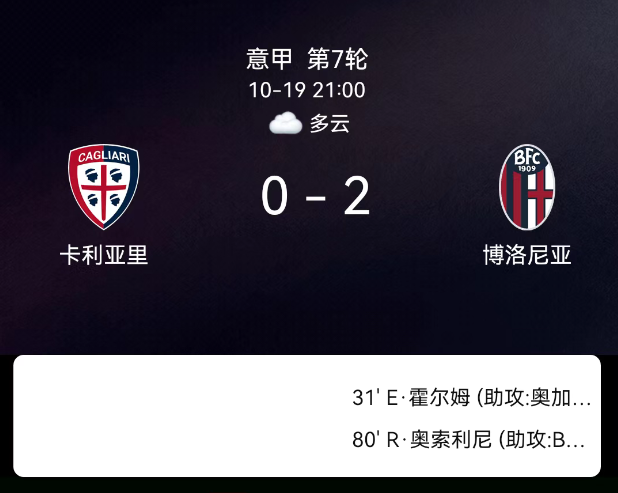 北京时间10月19日,2023-2024赛季意大利足球顶级联赛第7轮,卡利亚里主场迎战博洛尼亚。第31分钟,厄德高助攻霍尔姆破门,博洛尼亚1-0;第55分钟,卡利亚里球员犯规吃黄;第80分钟,多明格斯助攻奥尔索利尼破门,博洛尼亚2-0。最终比分,卡利亚里0-2博洛尼亚。