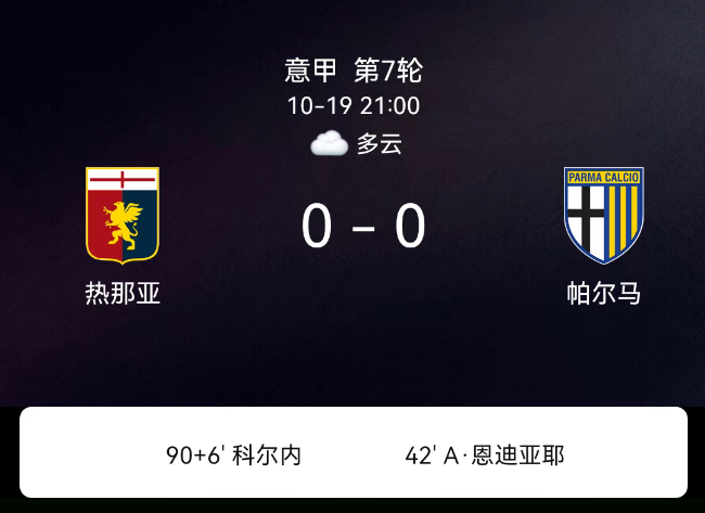 北京时间10月19日,意大利足球顶级联赛第7轮,热那亚主场迎战帕尔马。第42分钟,帕尔马阿卜杜拉耶-恩迪亚耶两黄变一红离场;全场双方均无进球。最终比分,热那亚0-0帕尔马。