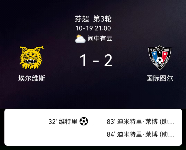北京时间10月19日,芬兰足球超级联赛争冠组第3轮,埃尔维斯主场迎战图尔库国际。第32分钟,维特利点射破门,埃尔维斯1-0;第45分钟,埃尔维斯球员犯规吃黄;第83分钟,DimitriLegbo破门,图尔库国际1-1;第84分钟,DimitriLegbo再破门,图尔库国际2-1。最终比分,埃尔维斯1-2图尔库国际。