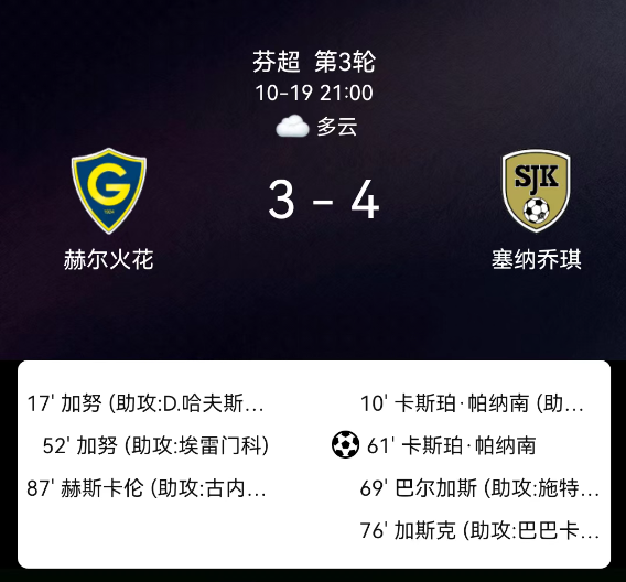 北京时间10月19日,芬兰足球超级联赛争冠组第3轮,赫尔火花主场迎战塞纳乔琪。第10分钟,KasperPaananen破门,塞纳乔琪1-0;第17分钟,RachideGnanou破门,赫尔火花1-1;第43分钟,赫尔火花球员犯规吃黄;第52分钟,RachideGnanou再破门,赫尔火花2-1;第61分钟,KasperPaananen点射扳平,塞纳乔琪2-2;第69分钟,巴尔加斯破门,塞纳乔琪3-2;第76分钟,ValentínGasc破门,塞纳乔琪4-2;第87分钟,希斯卡宁破门,赫尔火花3-4。最终比分,赫尔火花3-4塞纳乔琪。