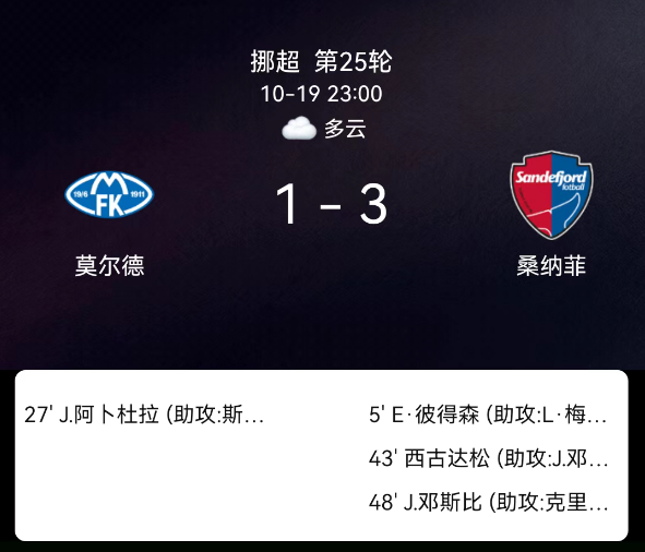 北京时间10月19日,挪威足球超级联赛第25轮,莫尔德主场迎战桑讷菲尤尔。第5分钟,EdvardSundb?Pettersen破门,桑讷菲尤尔1-0;第27分钟,贾拉勒-阿卜杜拉伊破门,莫尔德1-1;第35分钟,莫尔德球员犯规吃黄;第43分钟,S-西于尔达尔松破门,桑讷菲尤尔2-1;第48分钟,JakobDunsby破门,桑讷菲尤尔3-1。最终比分,莫尔德1-3桑讷菲尤尔。