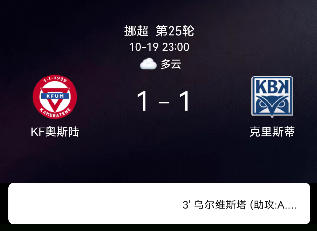 第80分钟(进球):KFUM奥斯陆扳平比分!恩杰助攻MameMorNdiaye破门,帮助主队将比分追至1-1平。