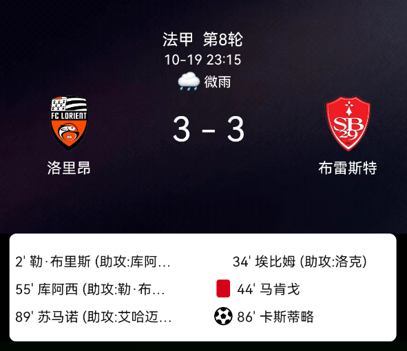 北京时间10月19日,法国足球甲级联赛第8轮,洛里昂主场迎战布雷斯特。第2分钟,勒布里斯破门,洛里昂1-0;第34分钟,埃宾贝破门,布雷斯特1-1;第44分钟,马肯戈自摆乌龙,布雷斯特2-1;第55分钟,夸西破门,洛里昂2-2;第72分钟,布雷斯特球员犯规吃黄;第86分钟,德尔卡斯蒂略点射,布雷斯特3-2;第89分钟,苏马诺破门,洛里昂3-3。最终比分,洛里昂3-3布雷斯特。