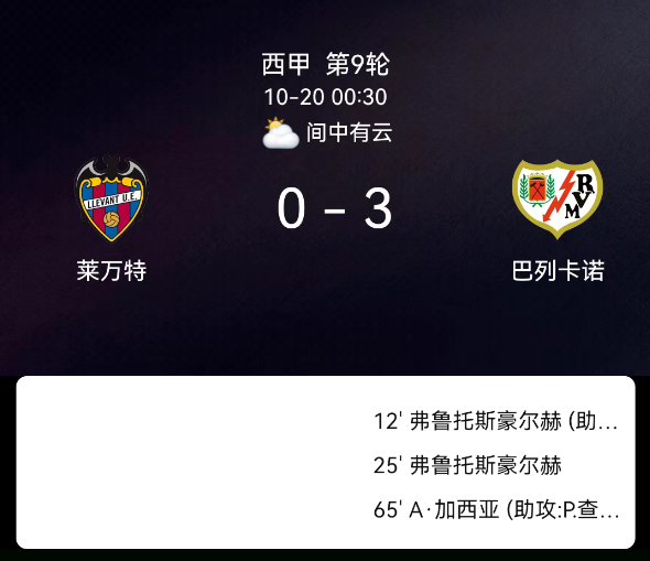 北京时间10月20日,西班牙足球甲级联赛第9轮,莱万特主场迎战巴列卡诺。第12分钟,德弗鲁托斯破门,巴列卡诺1-0;第25分钟,德弗鲁托斯再破门,巴列卡诺2-0;第49分钟,莱万特球员犯规吃黄;第65分钟,阿尔瓦罗-加西亚破门,巴列卡诺3-0。最终比分,莱万特0-3巴列卡诺。