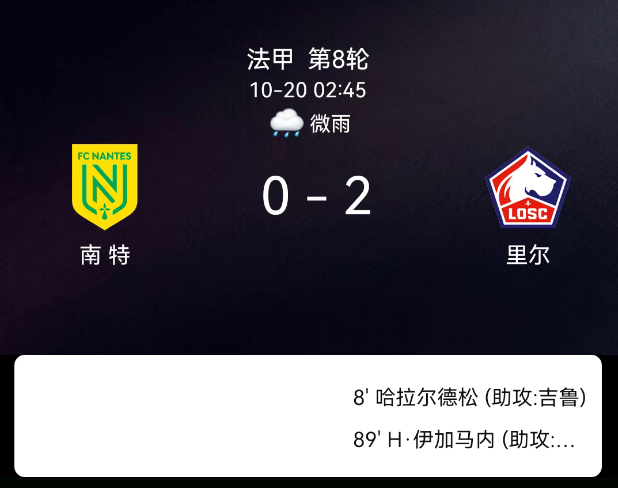 北京时间10月20日,法国足球甲级联赛第8轮,南特主场迎战里尔。第8分钟,哈康-哈拉尔德松破门,里尔1-0;第81分钟,佩罗犯规吃黄;第89分钟,伊加马内破门,里尔2-0。最终比分,南特0-2里尔。