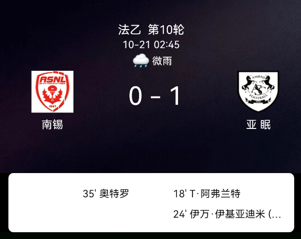 北京时间10月21日,法国足球乙级联赛第10轮,南锡主场对阵亚眠。第18分钟,阿维兰特罚丢点球;第24分钟,迪米破门,亚眠1-0;第35分钟,沃特罗罚丢点球;第68分钟,南锡球员犯规吃黄。最终比分,南锡0-1亚眠。