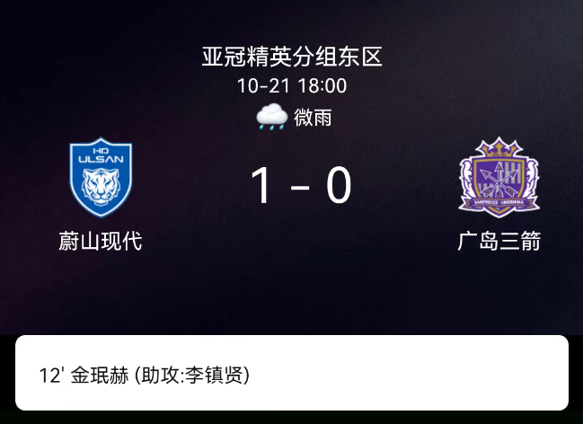 北京时间10月21日,亚足联冠军精英联赛第3轮,蔚山HD对阵广岛三箭。第12分钟,金珉赫破门,蔚山HD1-0;第49分钟,广岛三箭球员犯规吃黄;第78分钟,蔚山HD球员犯规吃黄。最终比分,蔚山HD1-0广岛三箭。