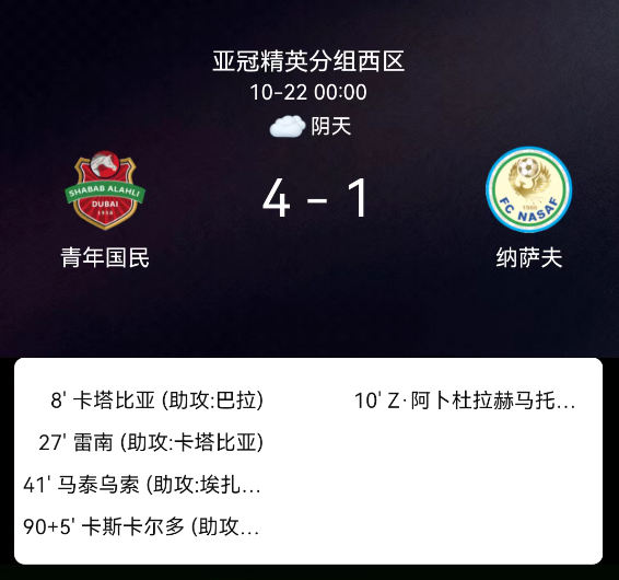 北京时间10月22日,亚足联冠军精英联赛第3轮,迪拜青年国民迎战纳萨夫。第8分钟,卡塔维亚破门,迪拜1-0;第10分钟,阿卜杜拉赫马托夫破门,纳萨夫1-1;第21分钟,纳萨夫球员吃黄;第27分钟,雷南破门,迪拜2-1;第41分钟,马特乌桑破门,迪拜3-1;第90+5分钟,布雷诺-莱莫斯破门,迪拜4-1。最终比分,迪拜青年国民4-1纳萨夫。