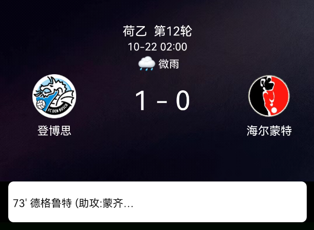 北京时间10月22日,荷兰乙级联赛第12轮,邓伯什主场对阵赫尔蒙德。第41分钟,赫尔蒙德球员犯规吃黄;第73分钟,德赫罗特破门,邓伯什1-0。最终比分,邓伯什1-0赫尔蒙德。