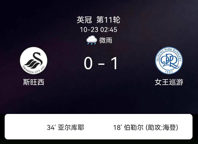 北京时间10月23日,英格兰足球冠军联赛第11轮,斯旺西主场迎战女王公园巡游者。第18分钟,伯勒尔破门,女王公园1-0;第29分钟,女王公园球员吃黄;第34分钟,马利克-亚尔库耶染红离场;第35分钟,库克吃黄;第41分钟,伊达吃黄。最终比分,斯旺西0-1女王公园巡游者。