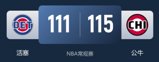 短暂休整后,活塞队杜伦与霍兰轮番发力试图缩小分差,但公牛队武切维奇总能及时回应,三节结束后,公牛队依然领先15分。末节比赛风云突变,活塞队康宁汉姆单节得分上双,成功抹平分差。决胜时刻,公牛队关键挑战成功,吉迪两罚全中,而活塞队连续尝试绝平均未果,最终公牛队以115-111的比分力克活塞队。