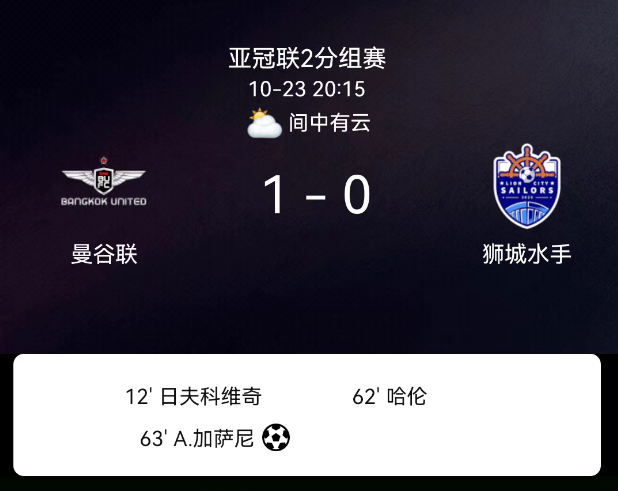 北京时间10月23日,亚足联冠军联赛二级联赛小组赛第3轮,曼谷联对阵狮城水手。第12分钟,日夫科维奇罚丢点球;第62分钟,哈里斯-哈伦染红离场;第63分钟,穆赫辛-加萨尼点球破门,曼谷联1-0;第79分钟,宋宜荣吃黄。最终比分,曼谷联1-0狮城水手。