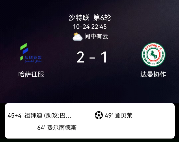 第45+4分钟(进球):哈萨征服打破僵局!穆拉德-巴特纳送出助攻,法赫德-祖贝迪推射破门,主队1-0领先。