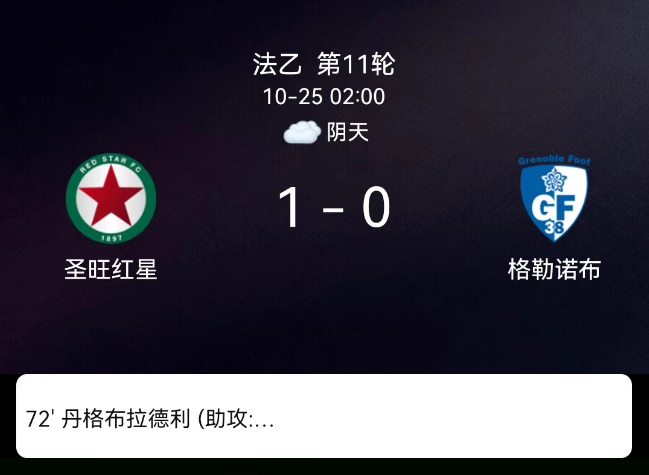 北京时间10月25日,法国足球乙级联赛第11轮,红星迎战格勒诺布尔。第45分钟,格勒诺布尔球员吃黄;第72分钟,当热破门,红星1-0;第88分钟,红星球员吃黄。最终比分,红星1-0格勒诺布尔。