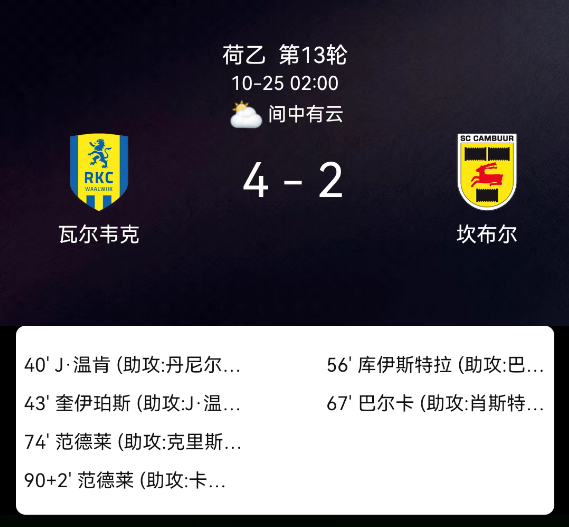 北京时间10月25日,荷兰乙级联赛第13轮,瓦尔韦克迎战坎布尔。第40分钟,耶斯佩尔-于内肯破门,瓦尔韦克1-0;第43分钟,凯珀斯破门,瓦尔韦克2-0;第56分钟,Wiebe-Kooistra破门,坎布尔1-2;第67分钟,巴尔克破门,坎布尔2-2;第58分钟,坎布尔球员吃黄;第74分钟,Tim-van-der-Leij破门,瓦尔韦克3-2;第90+2分钟,Tim-van-der-Leij破门,瓦尔韦克4-2。最终比分,瓦尔韦克4-2坎布尔。