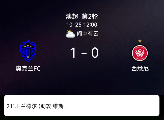 北京时间10月25日,澳大利亚足球超级联赛第二轮,奥克兰FC迎战西悉尼流浪者。第21分钟,兰达尔破门,奥克兰FC1-0;第73分钟,山姆-科斯格罗夫吃黄;第88分钟,希克卢纳吃黄。最终比分,奥克兰FC1-0西悉尼流浪者。