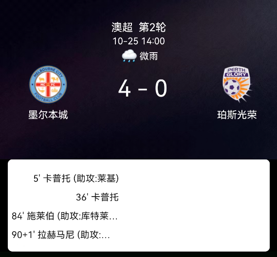 北京时间10月25日,澳大利亚足球超级联赛第二轮,墨尔本城迎战珀斯光荣。第5分钟,卡普托破门,墨尔本城1-0;第36分钟,卡普托破门,墨尔本城2-0;第68分钟,珀斯光荣球员吃黄;第84分钟,赞恩-施赖伯破门,墨尔本城3-0;第90+1分钟,拉赫马尼破门,墨尔本城4-0。最终比分,墨尔本城4-0珀斯光荣。