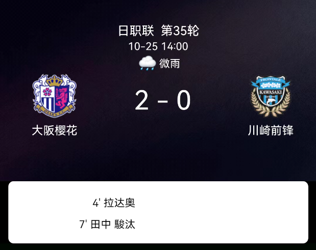 北京时间10月25日,日本职业联赛J1联赛第35轮,大阪樱花迎战川崎前锋。第4分钟,拉斐尔-拉唐破门,大阪樱花1-0;第7分钟,田中骏汰破门,大阪樱花2-0;第79分钟,川崎前锋球员吃黄。最终比分,大阪樱花2-0川崎前锋。