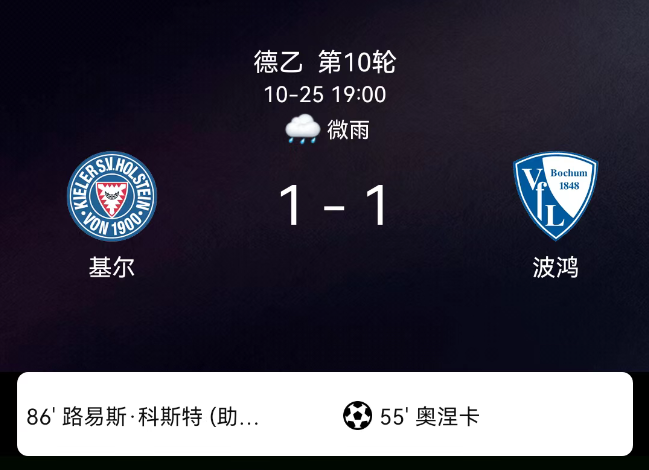 北京时间10月25日,德国足球乙级联赛第10轮,荷尔斯泰因基尔迎战波鸿。第38分钟,基尔球员吃黄;第55分钟,弗朗西斯-奥涅卡破门,波鸿1-0;第72分钟,波鸿球员吃黄;第86分钟,Louis-Kster破门,基尔1-1。最终比分,荷尔斯泰因基尔1-1波鸿。