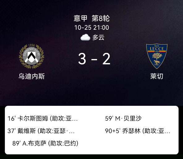 北京时间10月25日,意甲联赛第8轮,乌迪内斯迎战莱切。第16分钟,卡尔斯特伦破门,乌迪内斯1-0;第37分钟,凯南-戴维斯破门,乌迪内斯2-0;第59分钟,梅东-贝里沙破门,莱切1-2;第75分钟,莱切球员吃黄;第89分钟,布克萨破门,乌迪内斯3-1;第90+6分钟,恩德里破门,莱切2-3。最终比分,乌迪内斯3-2莱切。