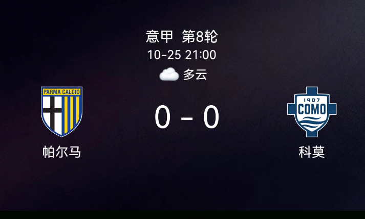 北京时间10月25日,意大利足球顶级联赛第8轮,帕尔马迎战科莫。第28分钟,帕尔马球员吃黄;第55分钟,科莫球员吃黄;第79分钟,帕尔马再吃黄。最终比分,帕尔马0-0科莫。