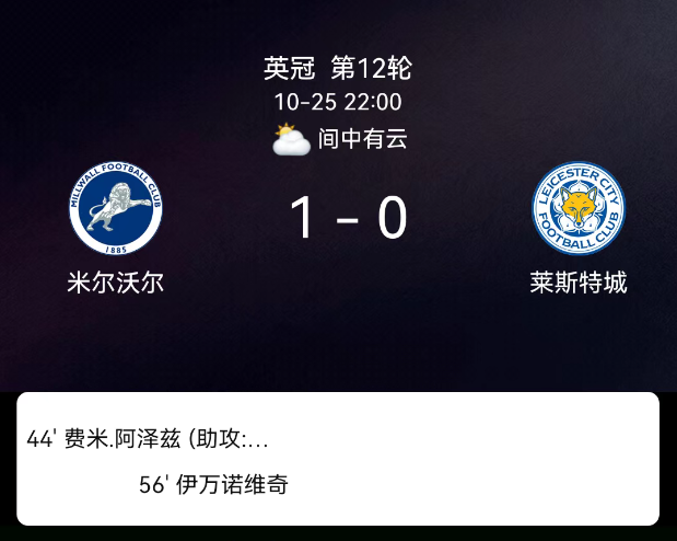 北京时间10月22日,英格兰足球冠军联赛第12轮,米尔沃尔迎战莱斯特城。第44分钟,阿齐兹破门,米尔沃尔1-0;第56分钟,伊万诺维奇吃黄。最终比分,米尔沃尔1-0斯托克城。