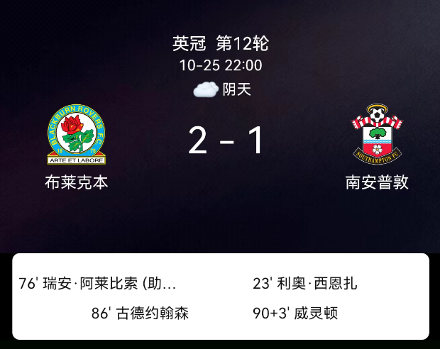 北京时间10月25日,英格兰足球冠军联赛第12轮,布莱克本流浪者迎战南安普顿。第23分钟,莱奥-斯恩萨破门,南安普顿1-0;第41分钟,布莱克本球员吃黄;第76分钟,阿莱比奥苏破门,布莱克本1-1;第86分钟,安德里-古德约翰森破门,布莱克本2-1;第90+4分钟,韦林顿染红。最终比分,布莱克本流浪者2-1南安普顿。