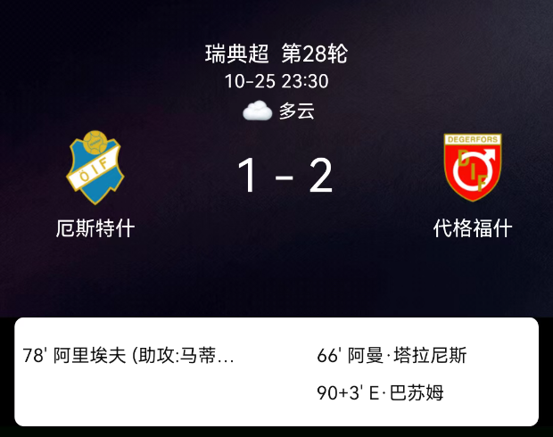 北京时间10月25日,瑞典足球超级联赛第28轮,厄斯特什迎战代格福什。第52分钟,厄斯特什球员吃黄;第66分钟,塔拉尼斯破门,代格福什1-0;第78分钟,阿利耶夫破门,厄斯特什1-1;第90+3分钟,Elias-Barsoum破门,代格福什2-1。最终比分,厄斯特什1-2代格福什。