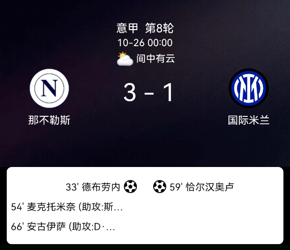 北京时间10月26日,意大利足球顶级联赛第8轮,那不勒斯迎战国际米兰。第34分钟,德布劳内破门,那不勒斯1-0;第54分钟,麦克托米奈破门,那不勒斯2-0;第60分钟,恰尔汗奥卢破门,国际米兰1-2;第63分钟,国际米兰球员吃黄;第67分钟,安古伊萨破门,那不勒斯3-1。最终比分,那不勒斯3-1国际米兰。