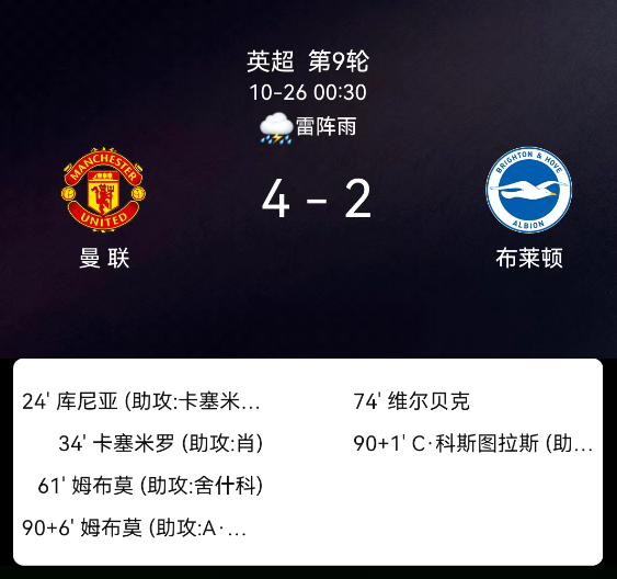 北京时间10月26日,英格兰足球顶级联赛第9轮,曼联迎战布莱顿。第24分钟,库尼亚破门,曼联1-0;第34分钟,卡塞米罗破门,曼联2-0;第41分钟,巴莱巴吃黄;第61分钟,姆伯莫破门,曼联3-0;第72分钟,多古吃黄;第75分钟,维尔贝克破门,布莱顿1-3;第90+2分钟,科斯图拉斯破门,布莱顿2-3;第90+7分钟,姆伯莫破门,曼联4-2。最终比分,曼联4-2布莱顿。