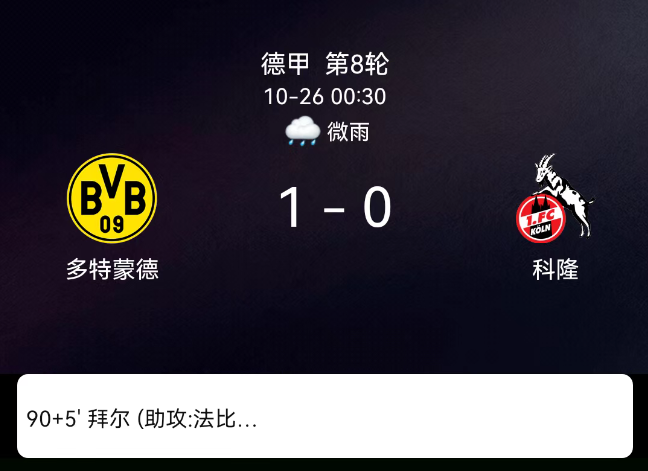 北京时间10月26日,2024-2025赛季德国足球甲级联赛第8轮,多特蒙德迎战科隆。第31分钟,科隆球员吃黄;第84分钟,许伯斯伤退(科隆少打1人);第90+7分钟,拜尔破门,多特蒙德1-0。最终比分,多特蒙德1-0科隆。