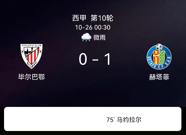 北京时间10月26日0:30,西班牙足球甲级联赛第10轮,毕尔巴鄂竞技迎战赫塔费。第32分钟,戈尔卡-古鲁泽塔吃黄;第75分钟,马约拉尔破门,赫塔费1-0;第88分钟,多明戈-杜阿尔特吃黄;第90分钟,迭戈-里科、马里奥-马丁吃黄。最终比分,毕尔巴鄂竞技0-1赫塔费。