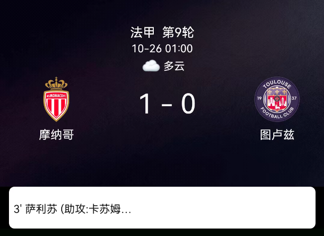 北京时间10月26日1:00,法甲联赛第9轮,摩纳哥迎战图卢兹。第3分钟,萨利苏破门,摩纳哥1-0;第18分钟,戈洛温吃黄;第34分钟,阿布-弗朗西斯吃黄;第45分钟,马马杜-库利巴利吃黄;第54分钟,埃默森-席尔瓦吃黄;第90+5分钟,查理-克莱斯威尔吃黄。最终比分,摩纳哥1-0图卢兹。