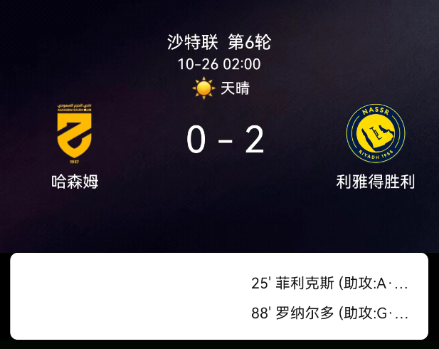 北京时间10月26日,沙特阿拉伯超级联赛第6轮,哈森姆迎战利雅得胜利。第14分钟,马内吃黄;第25分钟,菲利克斯破门,利雅得胜利1-0;第33分钟,索马吃黄;第88分钟,C罗破门,利雅得胜利2-0。最终比分,哈森姆0-2利雅得胜利。