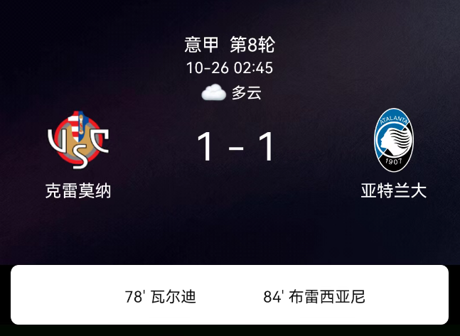 北京时间10月26日,意大利足球甲级联赛第8轮,克雷莫内塞迎战亚特兰大。第78分钟,瓦尔迪破门,克雷莫内塞1-0;第84分钟,布雷夏尼尼破门,亚特兰大1-1。最终比分,克雷莫内塞1-1亚特兰大。
