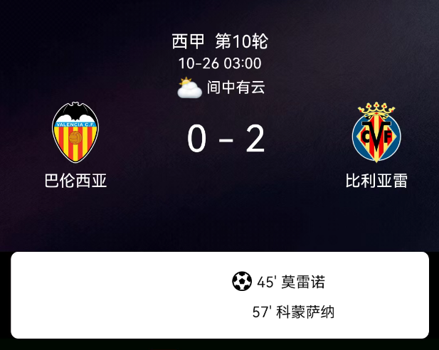 北京时间10月26日,西班牙足球甲级联赛第10轮,瓦伦西亚迎战比利亚雷亚尔。第15分钟,比利亚雷亚尔球员吃黄;第44分钟,莫雷诺破门,比利亚雷亚尔1-0;第57分钟,科梅萨尼亚破门,比利亚雷亚尔2-0;第44分钟、62分钟、73分钟、90分钟均有球员吃黄。最终比分,瓦伦西亚0-2比利亚雷亚尔。