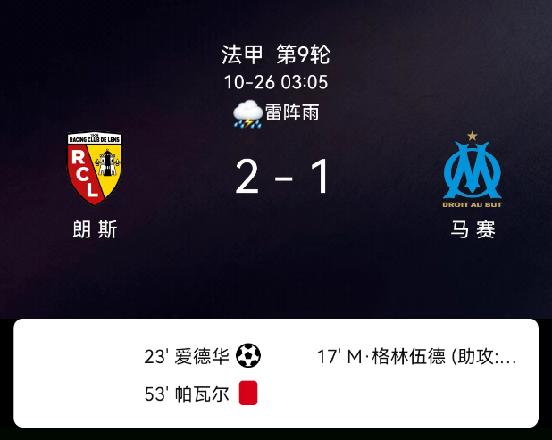 北京时间10月26日,法国足球甲级联赛第9轮,朗斯迎战马赛。第17分钟,格林伍德破门,马赛1-0;第23分钟,爱德华破门,朗斯1-1;第23分钟,马赛球员吃黄;第34分钟,阿德里安-托马森吃黄;第53分钟,帕瓦尔乌龙,朗斯2-1;第86分钟,马赛球员吃黄;第87分钟,莱昂纳多-巴勒迪吃黄;第88分钟,朗斯球员吃黄。最终比分,朗斯2-1马赛。